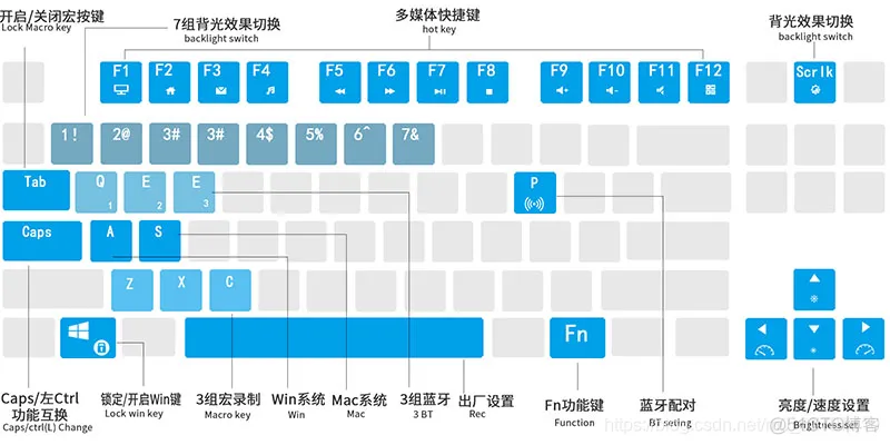 Fn+1-7 切换 7 组背光模式 Fn+Z/X/C 自定义宏按键 Fn+↑ 增加背光亮度\ Fn+8-9 自定义背光模式 Fn+P 蓝牙设置 Fn+↓ 减小背光亮度\ Fn+Tab 开启/关闭宏按键 Fn+空格 长按 3 秒 恢复出厂设置 Fn+← 减小背光变换速度\ Fn+Caps Caps/左 Ctrl 互换 Fn+ScLk 背光模式循环切换 Fn+→ 增加背光变幻速度\ Fn+Win 关闭/开启 Win 键 Fn+A 切换为 win 系统 Fn+S 切换为 Mac 系统